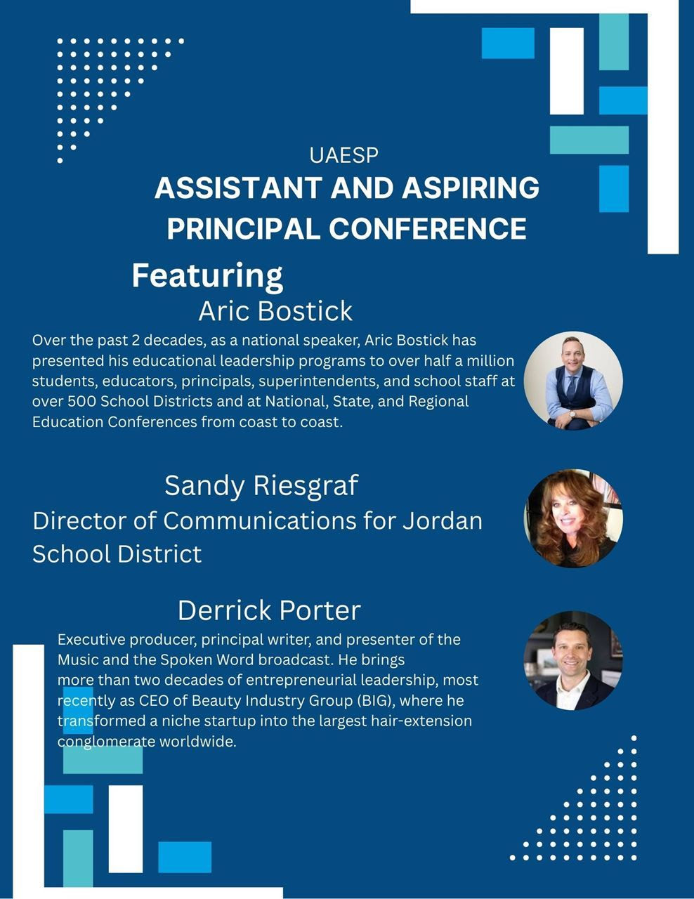 UAESP Assistant and Aspiring Principals Conference to be held December 2, 2025, at the Viridian Center in West Jordan. Check out the details and the awesome speakers (you will recognize one of them) for this conference!