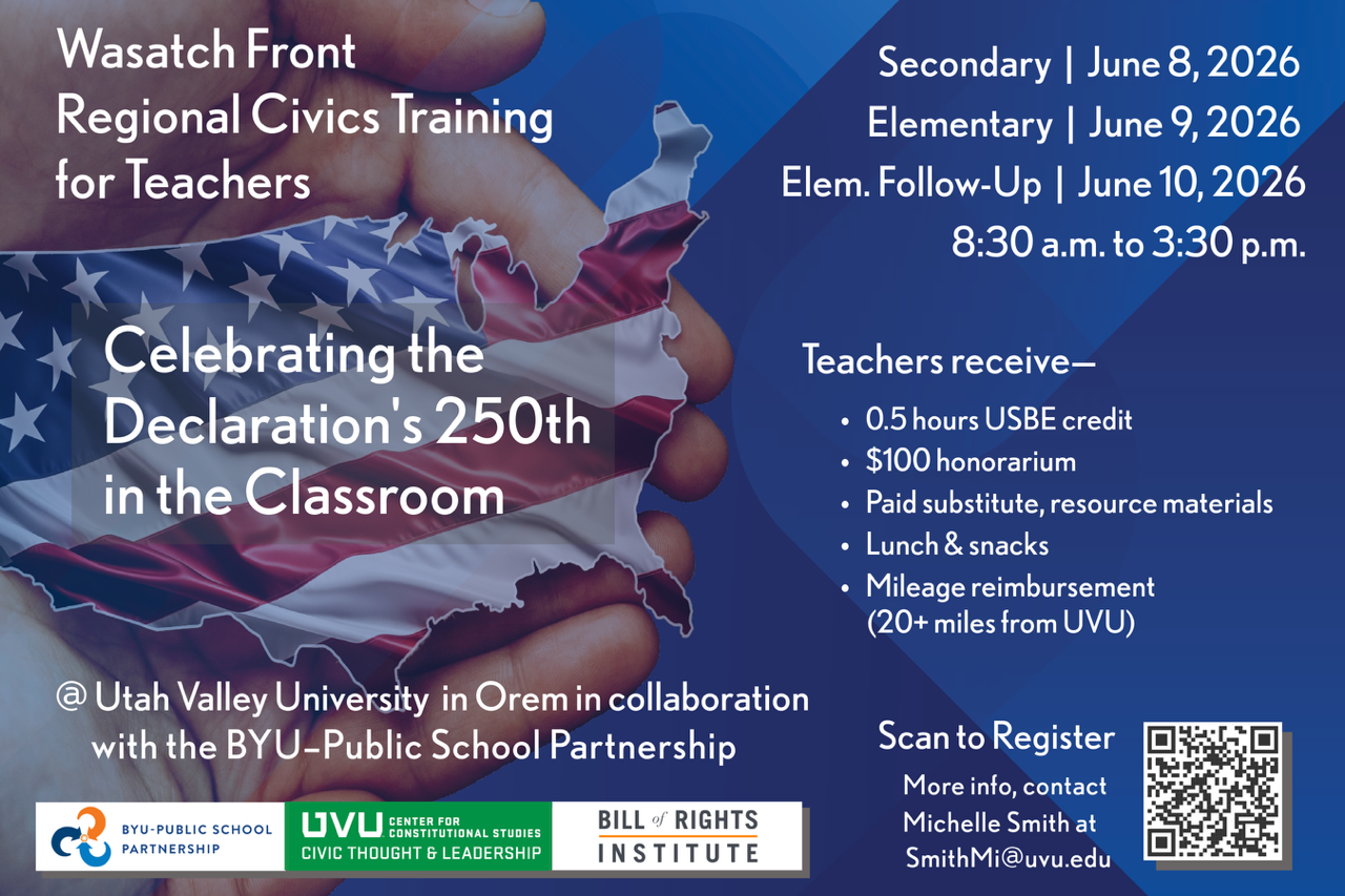 All teachers are invited to attend the Wasatch Front Regional Civics Training at Utah Valley University in Orem, celebrating the 250th anniversary of the Declaration of Independence. The event includes separate sessions for secondary teachers (June 8, 2026), elementary teachers (June 9, 2026), and an elementary follow-up (June 10, 2026), all from 8:30 a.m. to 3:30 p.m.
